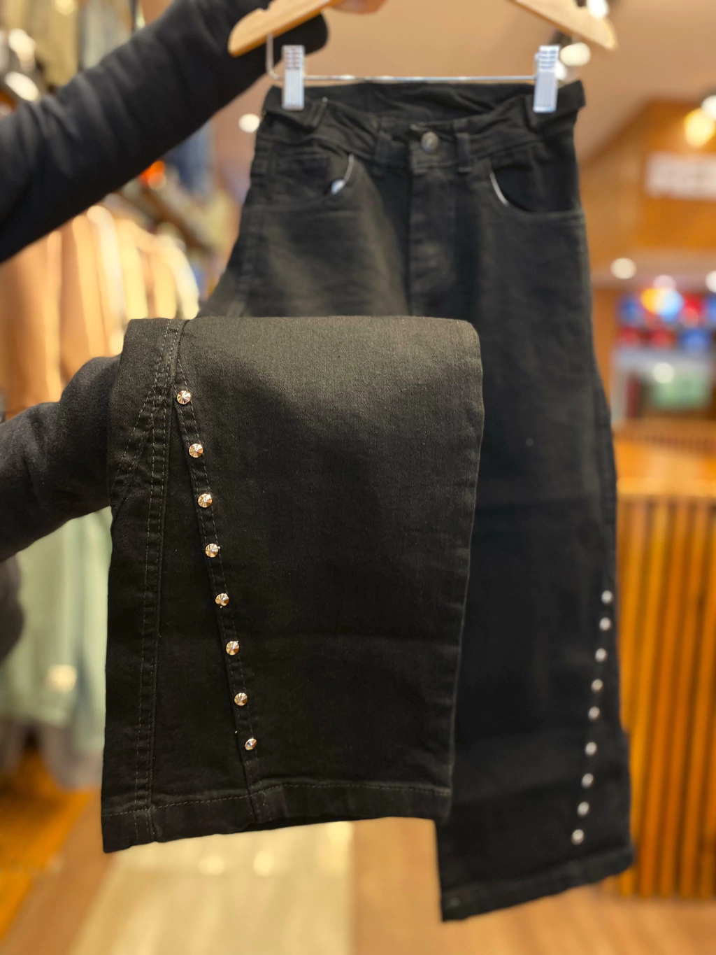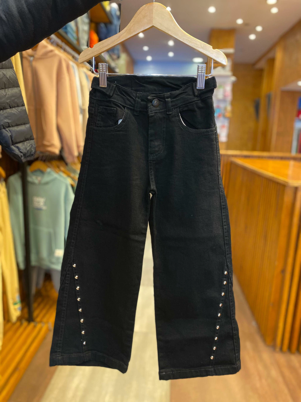Jean Palazo Elastizado con Cintura Regulable La elegancia y comodidad de este jean palazo en color negro, diseñado con cintura regulable para un ajuste perfecto. Su tela elastizada ofrece libertad de movimiento, mientras que las tachas diagonales aportan un detalle sofisticado y moderno. Disponible en talles del 6 al 16, es la prenda ideal para un look distinguido sin perder confort.