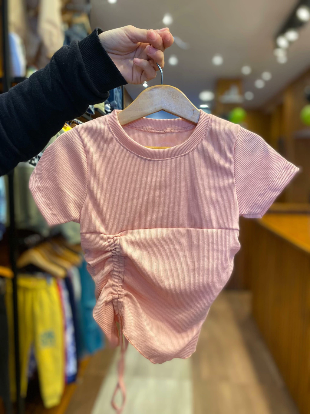 El diseño con frunce aporta un detalle delicado y moderno que realza cualquier conjunto. Ideal para usar en cualquier estación del año, gracias a su tejido de morley suave y cómodo.