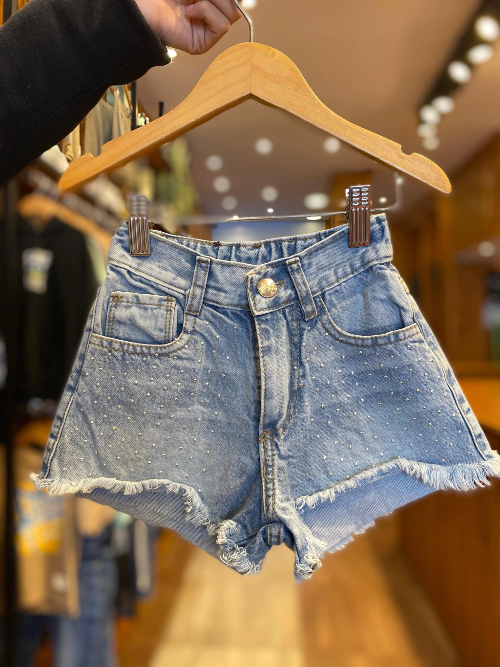 Descubrí el Short de Jean con elástico y strass bigoteado, la prenda ideal para las niñas que buscan comodidad y estilo. Disponible en talles del 6 al 16, este short combina la practicidad del elástico con un diseño único y brillante gracias a sus detalles en strass.